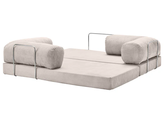 Comprising two quality mattresses and two angled cushions, TEDDY is designed for easy rearrangement. Secured by three chrome-plated metal bars, TEDDY maintains its flexibility. The mattresses, crafted from high-grade cold foam, strike a balance between firm support and comfort for both sitting and sleeping. The angled cushions are filled with silicon ball fiber encased in an inner fabric sleeve, allowing for easy removal of the outer fabric without disturbing the foam. TEDDY is swathed in plush corduroy fabric known for its exceptional quality and durability.